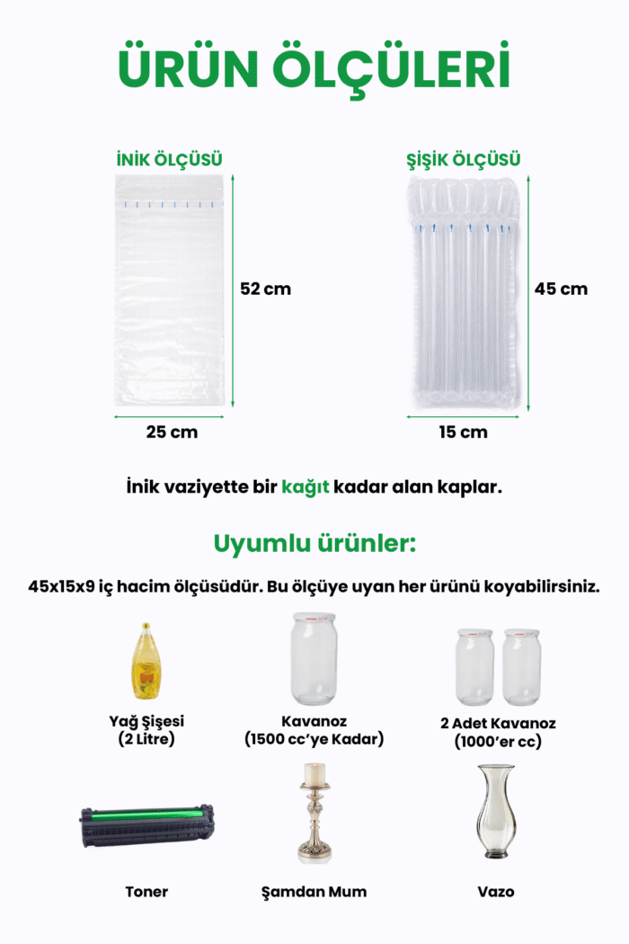 Bilsan Plastik Airbed ambalaj 25×52 ölçüsü ile farklı ürünler paketleyebilirsiniz.  Cam, şişe, büyük kavanoz, kozmetik, şampuan, saç kremi, oto akseusar, ev dekorasyon vb. farklı sektörlerdeki ürünler için uyum sağlar.  Ayrıca aynı kargo içerisinde 1’den fazla ürün gönderimi sağlıyorsanız, 25X52 airbed ölçüsüne çoklu ürün paketlemesi yaparak hepsini birden koruma altına alabilirsiniz.