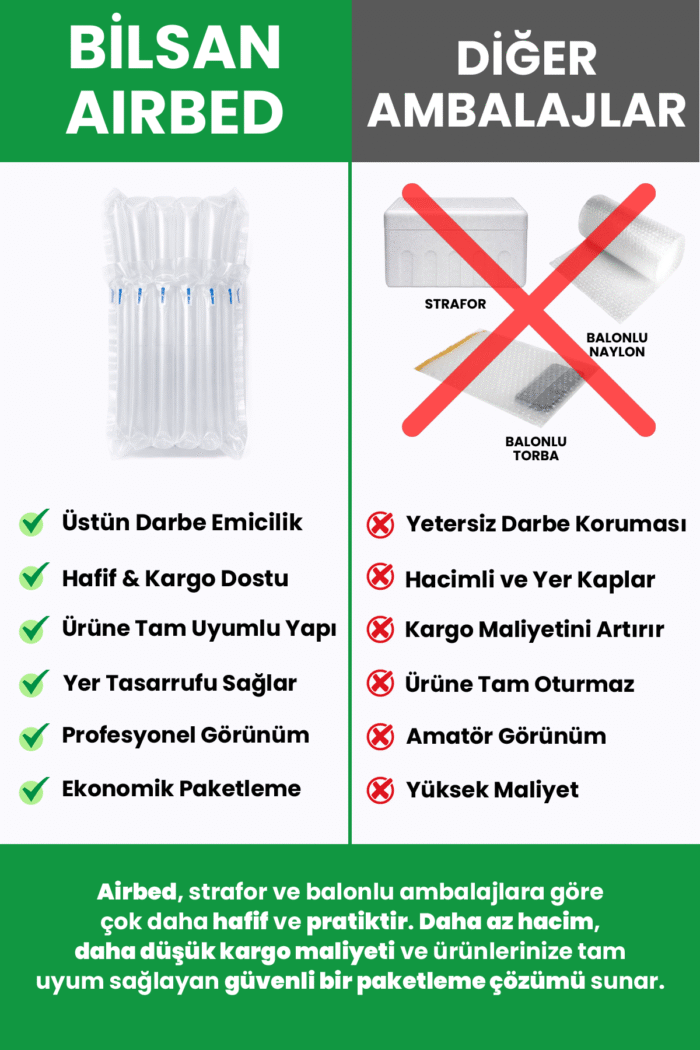 Hafif yapısı sayesinde kargo maliyetlerini azaltırken, geri dönüştürülebilir malzemesiyle çevre dostu bir çözüm sunar. Birkaç saniyede şişirilerek kullanıma hazır hale gelir ve operasyon hızını artırır. Hem e-ticaret firmaları hem de yerel üreticiler için profesyonel bir paketleme standardı oluşturur.